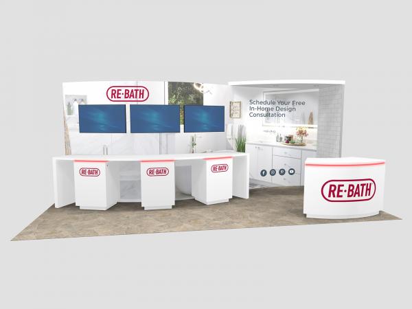 Quite often, a few custom elements added to the design can give the entire design a custom look even if it’s as simple as some colorful laminated workstations, shelves, or a reception counter. Custom laminated soffits and backlighting are also nice touches that are inexpensive and well worth the investment. As a bonus, if you re-rent the same exhibit, your second rental will most likely be less expensive, since your first rental covered the cost of those custom components.