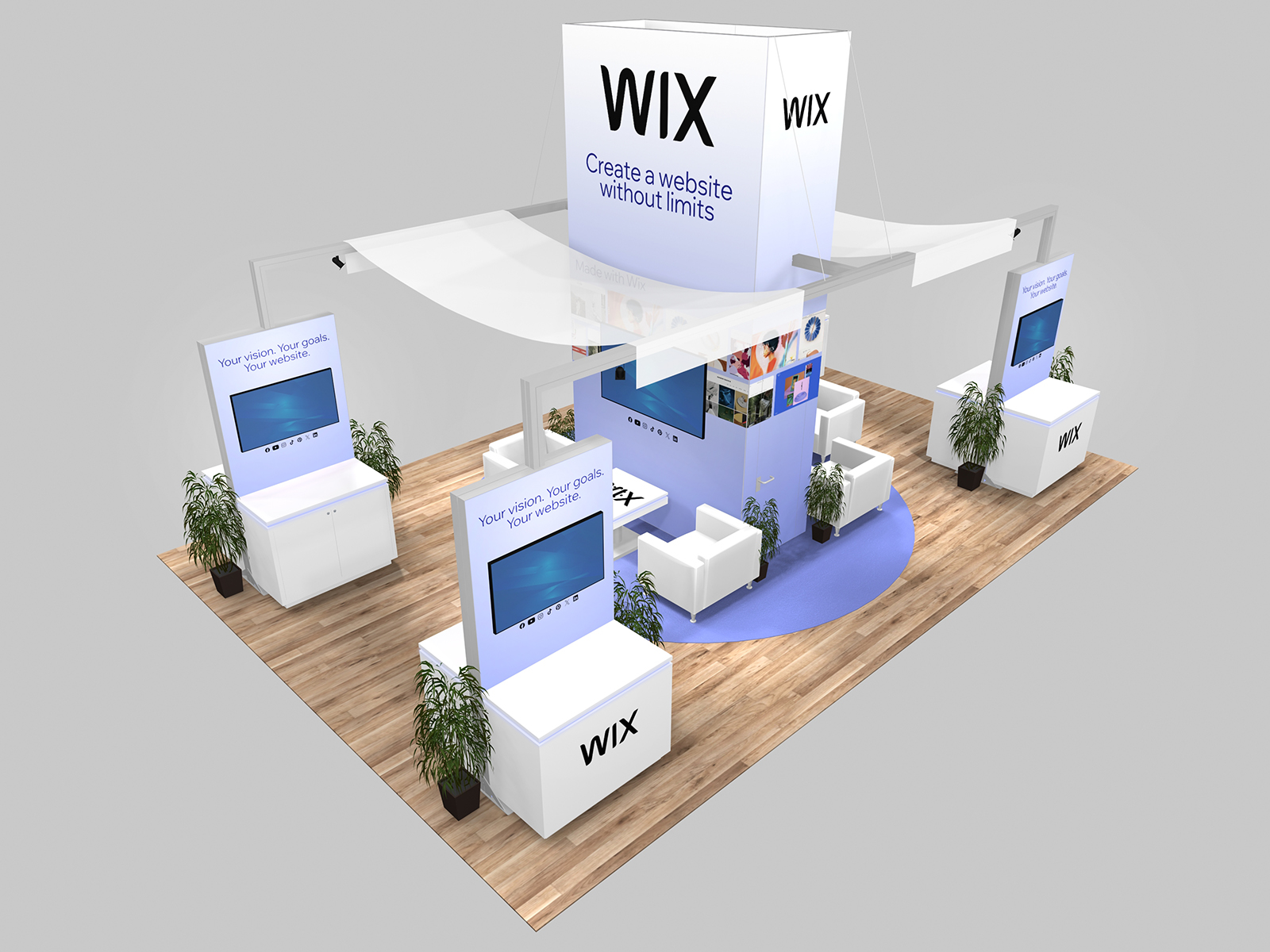 All three incorporate soft seating areas and charging tables for relaxed meetings. The towers serve multiple purposes. The height offers elevated brand visibility on the show floor and provides additional storage in the booth for promotional products, samples, literature, or personal items.