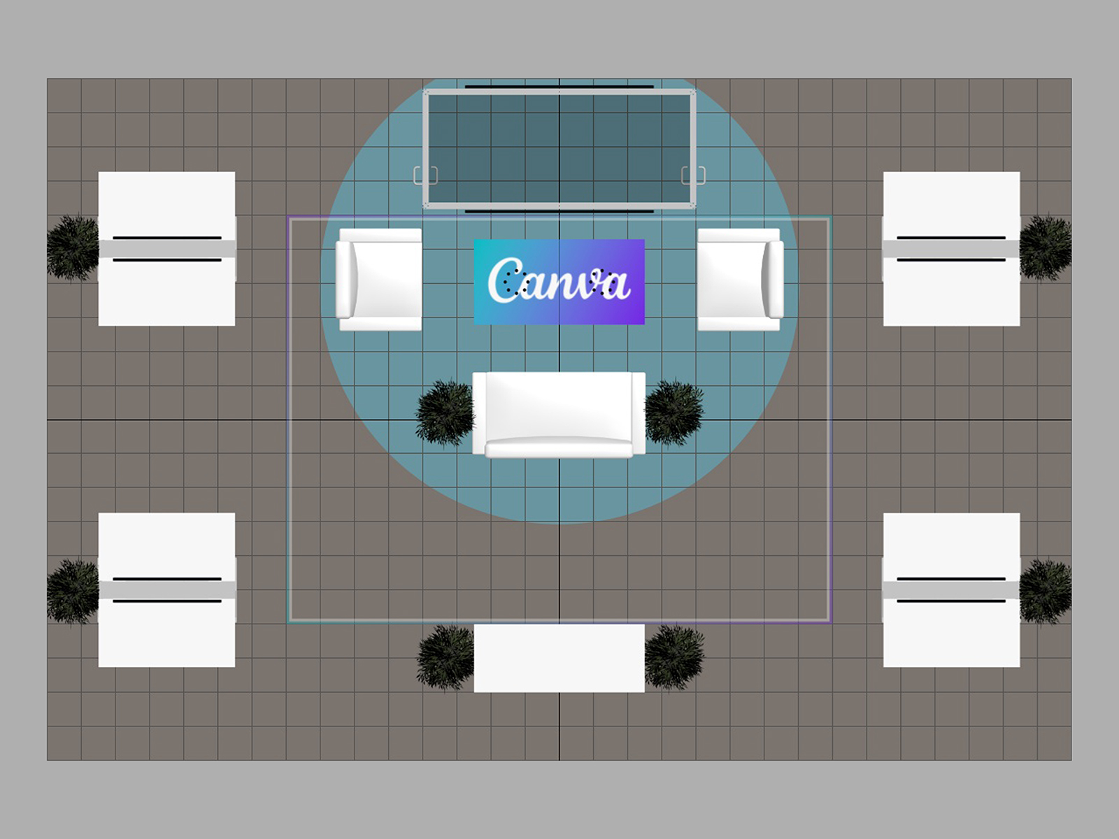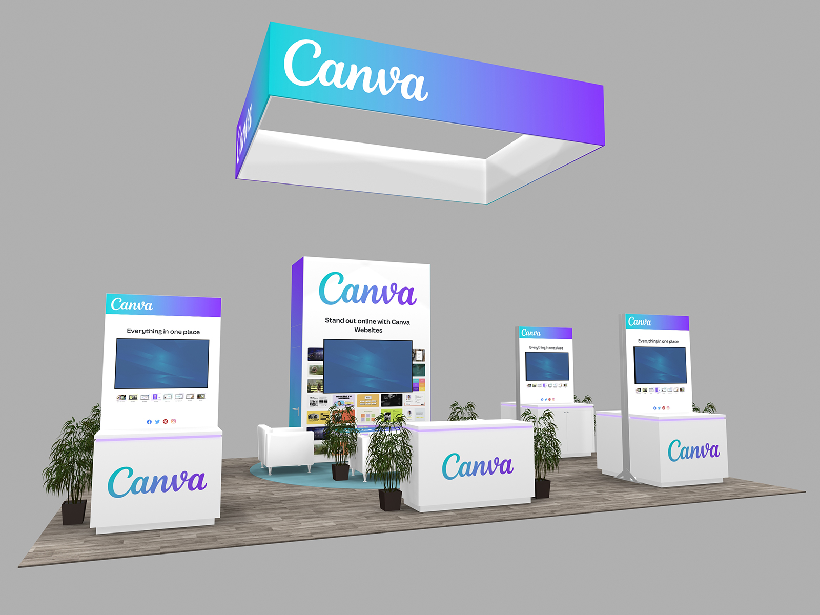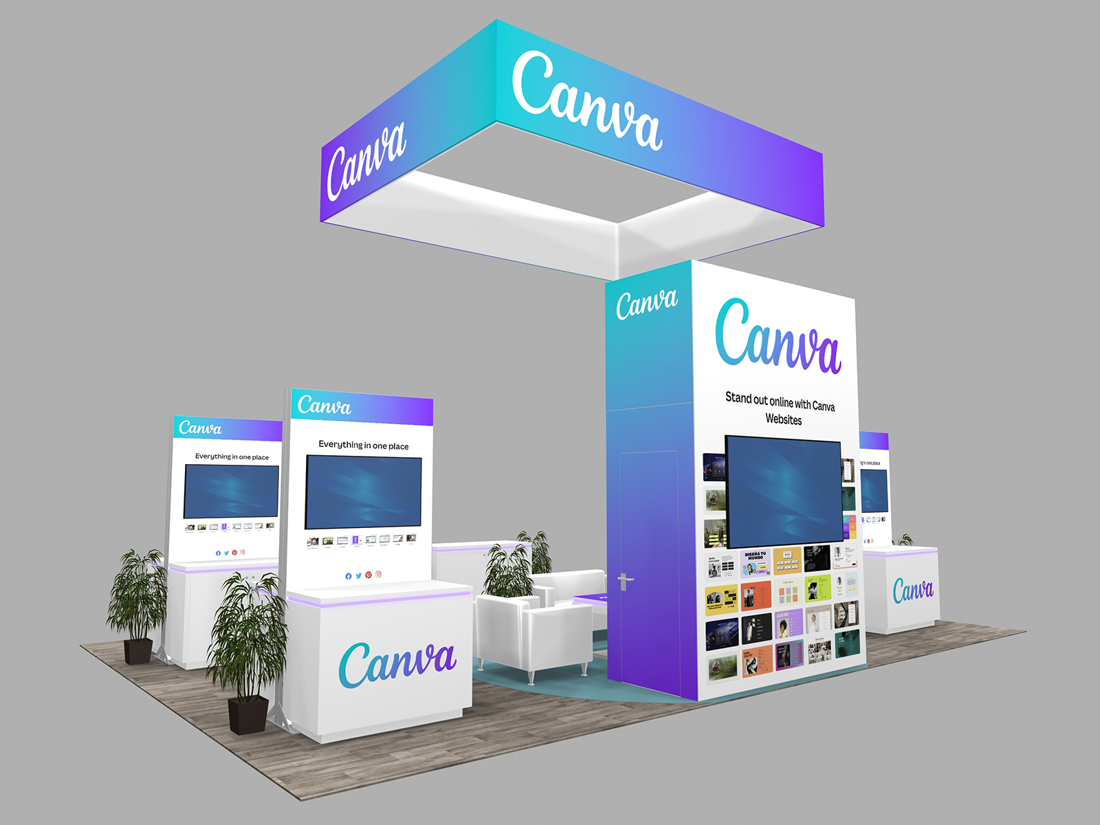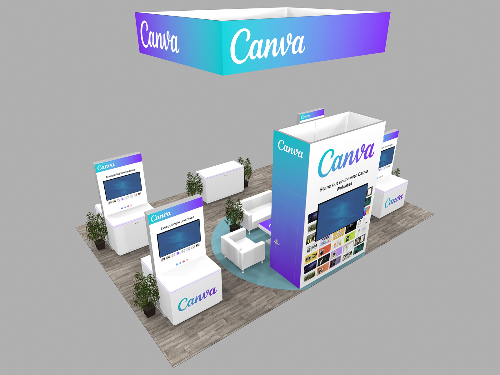 All three incorporate soft seating areas and charging tables for relaxed meetings. The towers serve multiple purposes. The height offers elevated brand visibility on the show floor and provides additional storage in the booth for promotional products, samples, literature, or personal items.