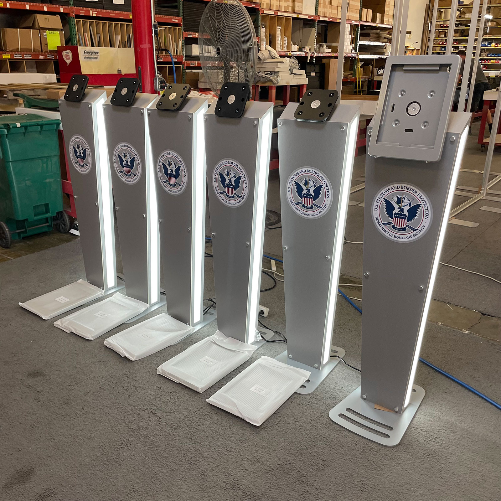 Shelves, (3) Double-sided Kiosk Lightboxes w/ Custom Counters (48"